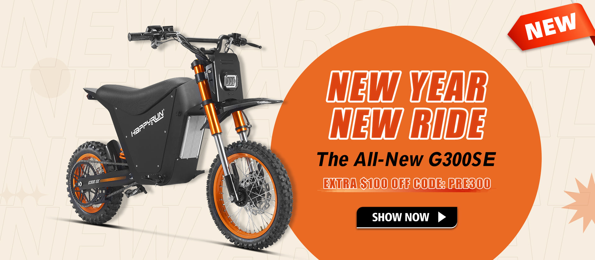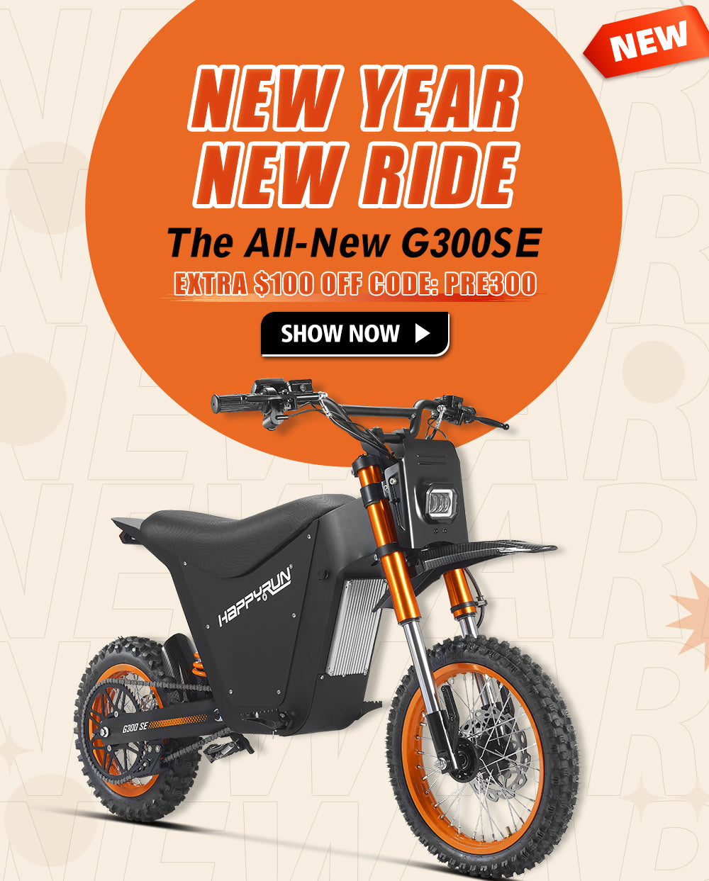 Our core promise remains the same: to keep every rider comfortable with ergonomic frames, smart dual-battery systems, and an industry-leading after-sales service network. The HappyRun G300 Pro electric dirt bike marks a major breakthrough. With a peak 6500W ultra-torque motor, 19/17 CTS off-road tires, and a Dynamic Multi-Terrain Shock Absorption System, it’s built to conquer city skylines and scale wild mountain ridges, and deliver a whole new level of riding freedom.