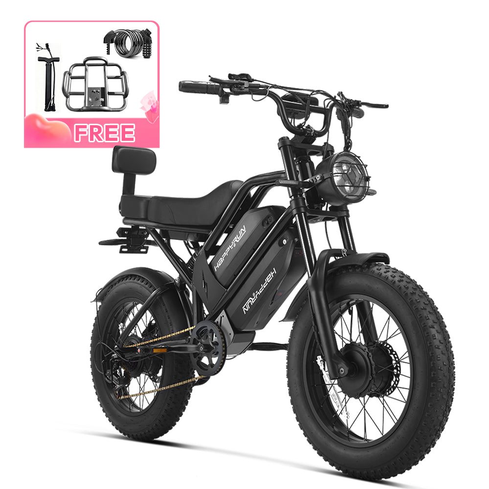 Within a $2000 budget, the HappyRun series offers several premium choices. The G70 cargo ebike ($1399) comes with a dual-battery system for long-distance rides. The G70 Pro ($1699) features dual 1000W motors with 5000W peak power, making it perfect for two-person rides. The G100 ($1099) has a retro design and a 38 mph top speed. The G60 Pro ($1199) offers a moped-style frame, a large-capacity battery, and dual hydraulic brakes—great for off-road trails.